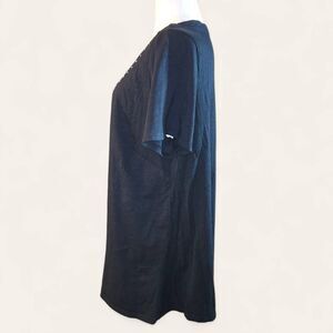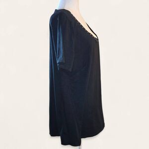 The Avenue Women's Size 20 Black Blouse is a versatile and stylish top perfect for various occasions such as travel, casual outings, and business meetings. Made from 100% cotton material with a solid black color and studded accents, this blouse features a round neckline, short sleeves, and a convenient pullover closure. The lightweight and stretchy fabric ensures comfort and a regular fit, making it suitable for all seasons including winter, summer, fall, and spring. Ideal for plus-size women looking for a basic yet fashionable addition to their wardrob