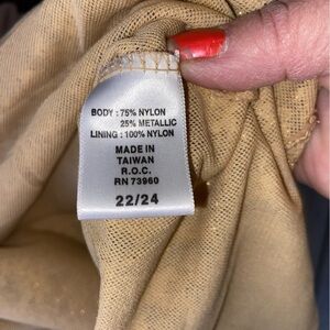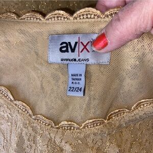 Avenue X gold lace sparkling top with scalloped wide vee neckline. 3/4 sleeves