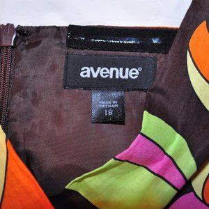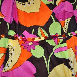 Avenue bright floral colors on dark brown background dress with embellished belt.
