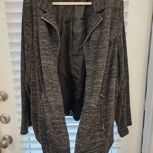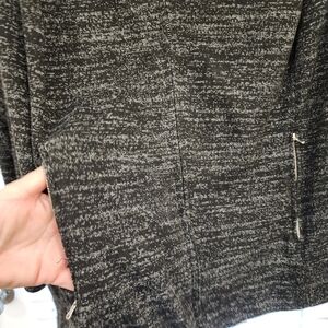 medium weight dress jacket. zip up and 2 zip pockets. could be worn as a coat or a suit look.