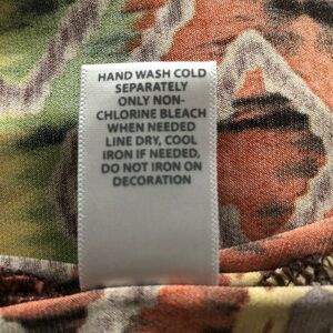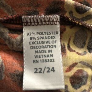 Avenue size 22/24 like new 92% polyester 8% spandex exclusive of decoration. Flashy design on the front. V neck. A thin piece of stretchy elastic in the middle of shirt