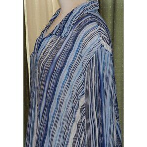 The Avenue size 26W / 28W top is a comfortable and stretchy poly blouse designed for plus size women. It features a striped pattern, V-neckline, and long sleeves, making it perfect for casual occasions. The pullover style and relaxed fit add to its ease of wearing, while the blue color adds a versatile touch to the wardrobe. Made from polyester, this blouse is suitable for all seasons and is a basic yet stylish addition to any woman's clothing collection. Hand wash and lay to dry.