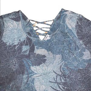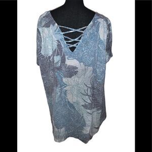 Blue multi stripe floral top. Rhinestones on front. Criss Cross back. Short sleeve. 50% polyester/50% rayon. Size: 22/24. Preowned in good condition.