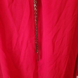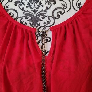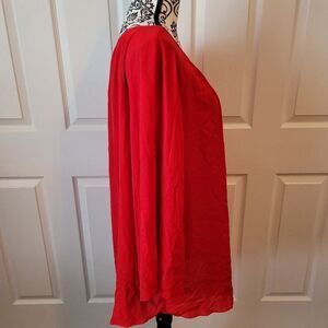 Really nice top. Excellent condition and quality. Made with all polyester materials. Lightweight and flowy. Tag says size 18/20. Is more of a true red than the pic shows. May need a cami underneath.