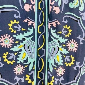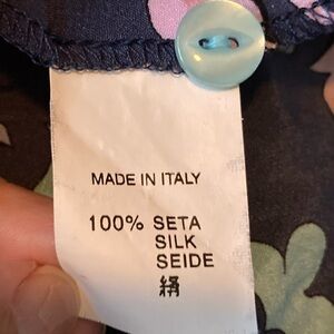 Averardo Bessi is a luxury Italian label founded in 1959 known for its prints. 60’s print silk button front shirt in blue with hidden button placket. Bessi pieces and prints are collectible.