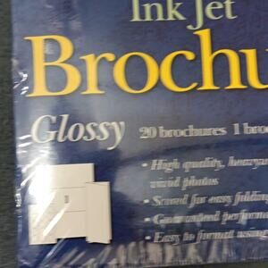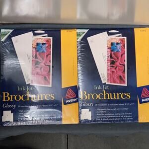 2 packages of unopened Avery 8384 Inkjet Glossy Brochures. Each package contains 20 brochures for 40 brochures total. Each brochure is 8 1/2" x 11" with score marks for easy tri-fold. "High quality heavyweight stock coated for vivid photos, mailing seals included." From a non-smoking home.