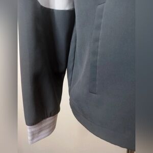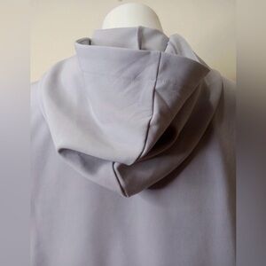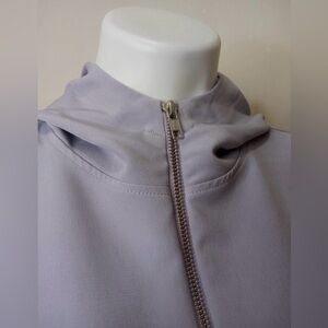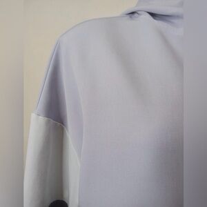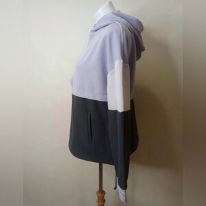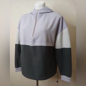Stylish and sporty Avia hooded windbreaker in a modern colorblock design featuring light lavender, white, and dark charcoal tones. This women’s size medium (8–10) pullover includes a half-zip front, drawstring hem, and zippered side pockets for functionality and comfort. Made with stretchy, lightweight fabric (88% polyester, 12% spandex), perfect for workouts or casual wear. Excellent condition.