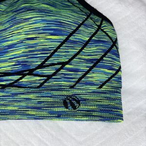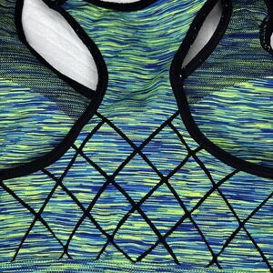 Keywords: Avia sports bra, racerback, compression fit, neon green blue knit, medium support, space dye activewear, black piping, gym bra, athletic top, performance bra