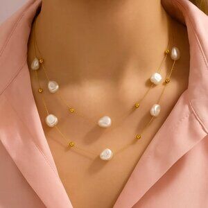“Aviara” Layered Pearl Necklace Stainless Steel