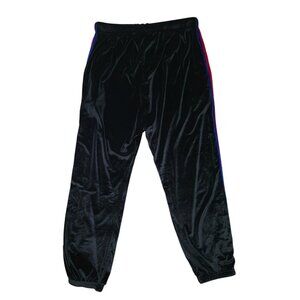 Velvet track pants with colorful stripes offer a unique style. The soft fabric ensures comfort, while the elastic waist provides a flexible fit. In EXCELLENT condition!