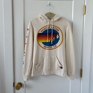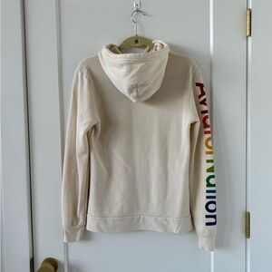 Cream hoodie featuring a vibrant rainbow logo from Aviator Nation. Includes colorful sleeve details. In great condition. Size small.