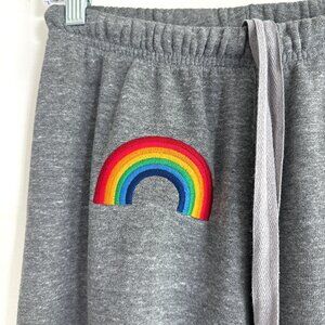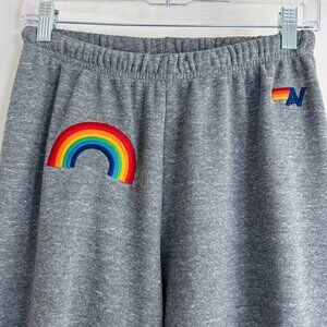 Aviator Nation rainbow embroidered sweatpants in Heather Grey. Hand-sewn in Los Angeles, soft and lightweight with a fleece lining, interior drawstring and a jogger-style hem.