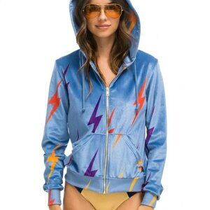 Aviator Nation Repeat Bolt Full Zip Velvet Hoodie in Blue Size Medium