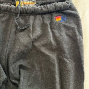 These stylish Aviator Nation Joggers feature a vibrant color stripe on a sleek gray and black design. Perfect for adding a pop of color to any outfit.