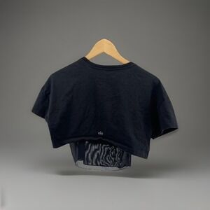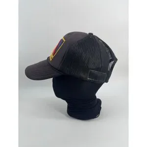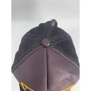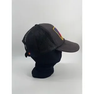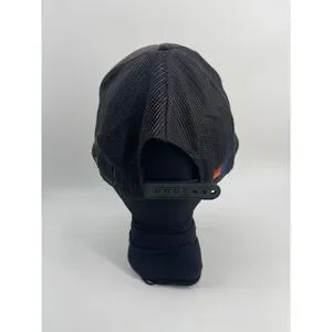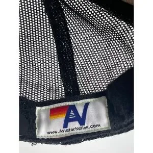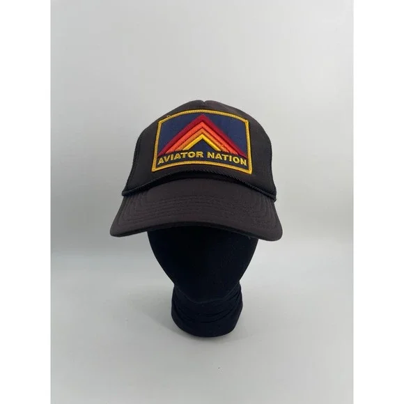 Pre-owned Aviator Nation trucker hat featuring the classic rainbow mountain logo patch on the front. Black hat with mesh back panels and adjustable snapback closure.