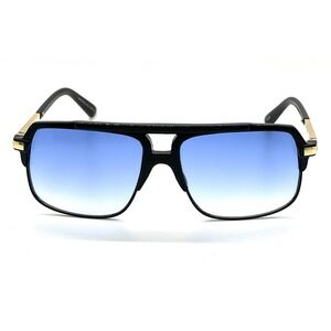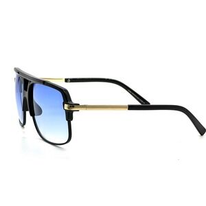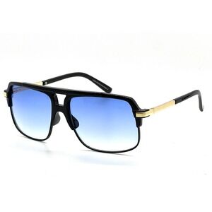 Stylish aviator sunglasses featuring a bold, black frame and striking blue gradient lenses. These sunglasses offer a modern twist on a classic design, perfect for adding a touch of cool to any outfit. The sleek black frame is complemented by gold accents at the temples, enhancing the overall aesthetic. Ideal for everyday wear, driving, or lounging by the pool, these sunglasses provide both fashion and function.