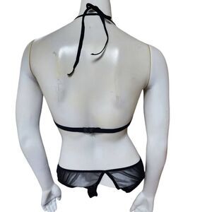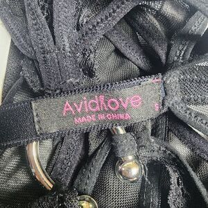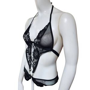 AvidLove deep V black lace and mesh crotchless teddy.