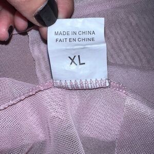Avidlove Pink Lace Babydoll Chemise in size XL featuring a deep V-neck lace bodice, sheer mesh skirt, and adjustable spaghetti straps. Sheer floral lace cups with a satin center bow create a romantic, sexy nightie look, while the flowy handkerchief hem adds trend-right fairycore softness. Fabric is lightweight and silky (95% polyester, 5% acrylic).