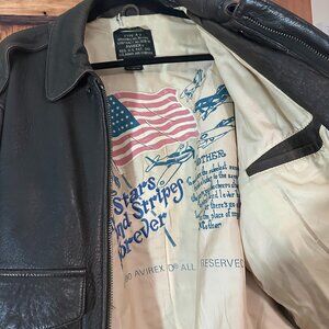 Vintage 1980s Type A2 Avirex Leather Us Army Air Forces Flight Jacket Made In Korea / Stars And Stripes Forever. Super well worn in, one defect on the back, but in excellent condition and beautiful chocolate brown. Incredible jacket.