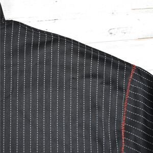 Stylish black jacket with red accents. Features pinstripe design. Comfortable fit with front pockets.