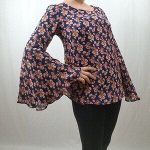 Avital Womens BOHO Dark Fairy Top Small Navy Ditsy Floral Bell Sleeve Casual NWT