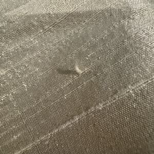 Aviva Stanoff is known for working with pressed botanical fabrics and silks, so I think that much of this piece if not all of it is silk. It's very soft. I see one pull at one edge and a couple of circles that I think are discoloration; Please see photos for details. I measured this at 90" long by 14.5" across. It is reversible, and the one side is patchwork / multi-colored while the other is a solid orange with green piping.