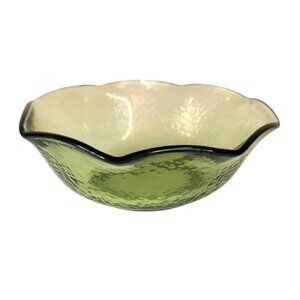 This vintage green glass bowl features a scalloped edge and a textured design, making it a unique addition to any glassware collection.