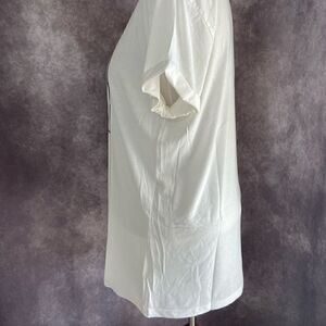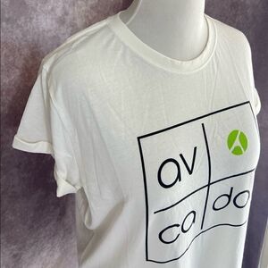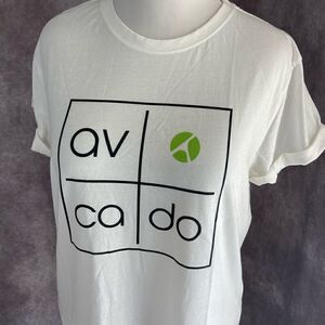 New vintage white Avocado tee shirt with avocado graphic print. Features a crew neckline and cuffed short sleeves. Roomy loose fitting casual tee. Size is X-Large. One tiny mark on the front bottom of tee - see picture #9.
