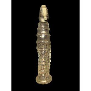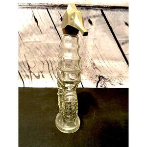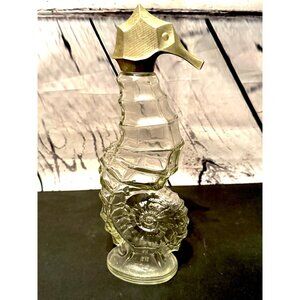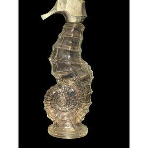 Vintage Avon bottle shaped like a seahorse. Clear glass with intricate details, featuring a stopper. A charming addition to any collection.