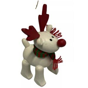 This handcrafted wooden reindeer ornament adds a classic touch to holiday decor. Its charming design features red antlers and a festive scarf, making it a versatile addition to any Christmas tree.