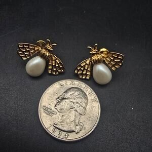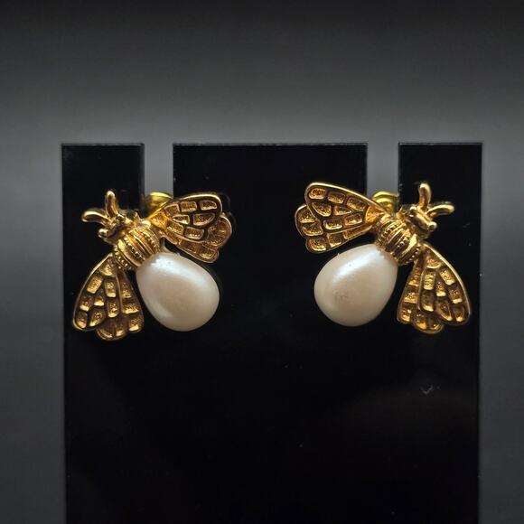 These vintage Avon 1989 Precious Bee earrings are for pierced ears and feature .75" x .6" gold tone bees with faux pearls