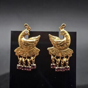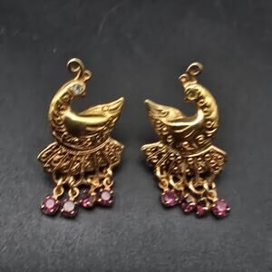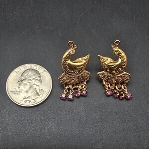 These vintage Avon 1994 Peacock Dangle earrings are for pierced ears and feature gold tone peacocks with tiny purple bead accents and measure 1.2" L x .6" W