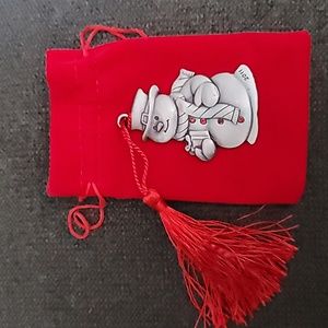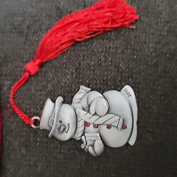 Ornament was never used. I purchased it to collect it and was kept in original pouch. Beautiful snowman with red stones.