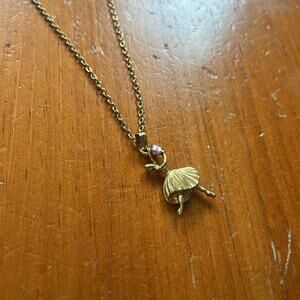 This elegant gold necklace features a charming ballerina pendant, perfect for adding a touch of grace to any outfit. The delicate chain and intricate design make it a standout piece in any jewelry collection. In great condition