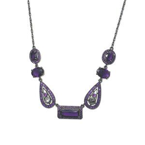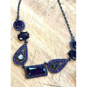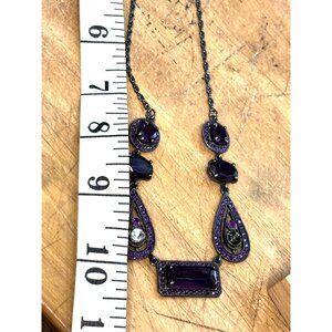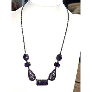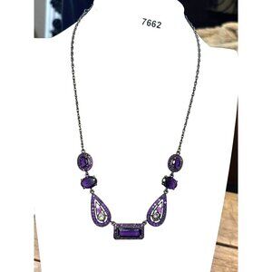 This antique-style necklace features rich purple gemstones and sparkling rhinestone accents, set in a black metal chain. It adds a sophisticated touch to any outfit.
