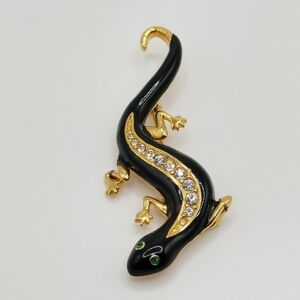 Avon Black Enamel Gold tone Lizard Salamander Brooch Clear Green Rhinestones Pin