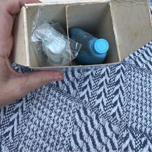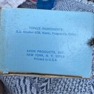 Elegant Avon box with Dutch Girl design. Features intricate blue patterns. Bottle has some discoloration. See photos
