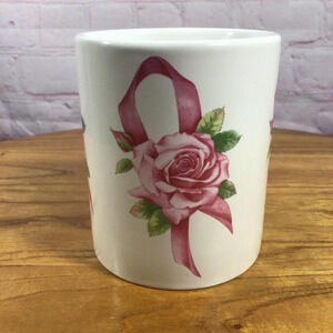 Avon Breast Cancer Awareness Crusade ceramic mug. This special mug has three images of a beautiful pink ribbon with a pink rose in the middle that wrap all the way around the mug. Measurements are approximately 3 3/4” tall, 3 1/4” in diameter at the rim, 4 1/2” wide including the handle. Great condition. No chips or cracks. Smoke free home.