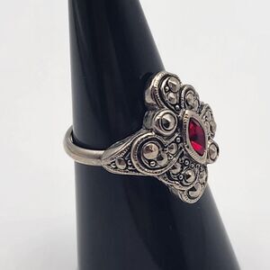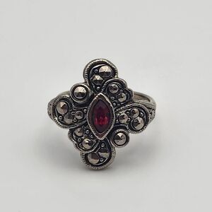 Avon Celtic style silver tone ring with faux marcasite and a faux Garnet cubic zirconia.