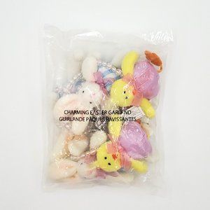 Charming Easter / spring garland from Avon (2006). Includes 3 miniature stuffed bunnies and 2 chicks joined by colorful iridescent beads. Attached loops on each end for hanging.