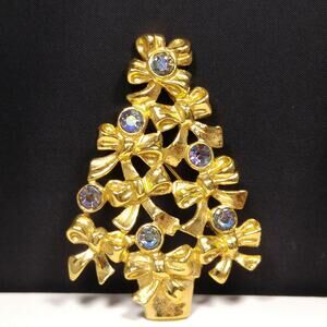 Celebrate the season with this beautiful vintage Avon Christmas Tree brooch from the 1960s. This collectible book piece is featured on page 17 of Christmas Tree Pins O Christmas Tree by Nancy Yunker Trowbridge. The brooch is designed with gold tone bows accented by sparkling blue aurora borealis rhinestone “lights.” A timeless holiday jewelry treasure, this brooch makes a festive accessory for a coat, sweater, hat, or bag. Perfect for collectors or as a thoughtful vintage gift.