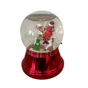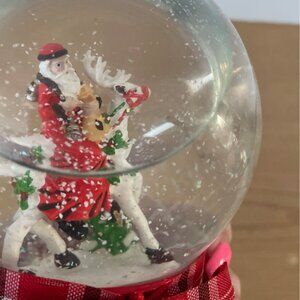 This charming snow globe features Santa riding a reindeer, encapsulating the holiday spirit with a gentle shake. The red base adds a festive touch.