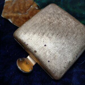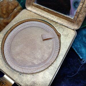 A little worn looking on outside, but inside has never been used. No powder, but powder sifter is pristine. Mirror is good too.