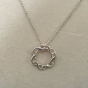 Silver-toned necklace featuring an infinity symbol enclosed in a circle.