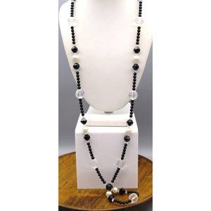 Avon Fabulous Facets Beaded Necklace, Faceted Black and Clear Acrylic Beads and White Faux Pearls, Vintage Flapper Length