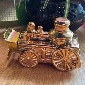 • Gold tone glass bottle in the shape of an antique fire truck, trunk shaped gold tone cap. Once upon a time housed Öland Cologne.