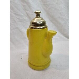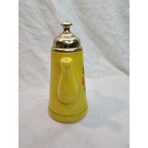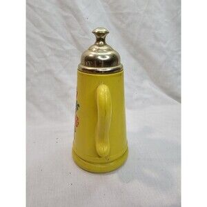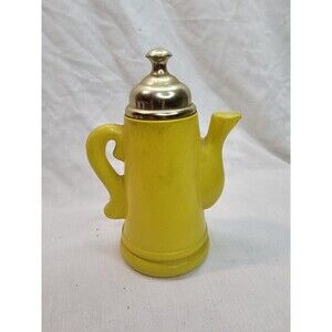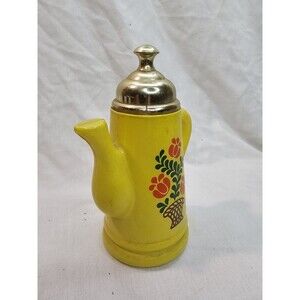 Charming vintage miniature teapot or coffee pot with a unique double-spout design. Features a glossy yellow ceramic body adorned with red flowers, green leaves, and a basket motif. Topped with a metallic lid and accented by a curved handle, this piece blends whimsy with retro kitchen charm.