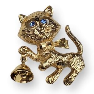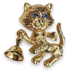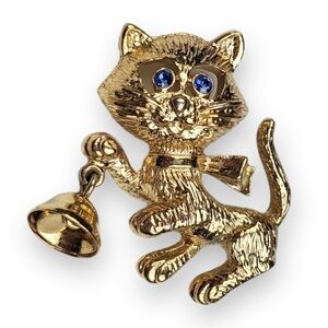 Adorable 70s cat brooch in shiny brushed yellow gold plate with blue rhinestone eyes and a small bell that jingles slightly