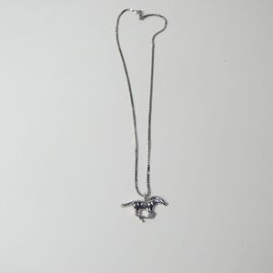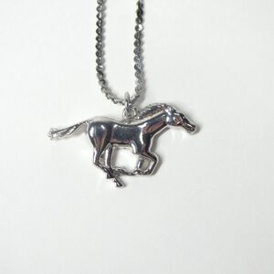 Vintage necklace pairing an Avon pendant of a galloping horse and a Monet necklace chain. Good shape with minor surface wear from handling.