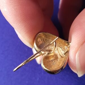 These Avon earrings feature a classic heart shape crafted from a lustrous gold-tone metal, offering a timeless elegance. The three-dimensional design adds depth, while the smooth, polished surface ensures a radiant shine. Perfect for everyday wear, they are secured with a delicate wire hook for easy and comfortable use.